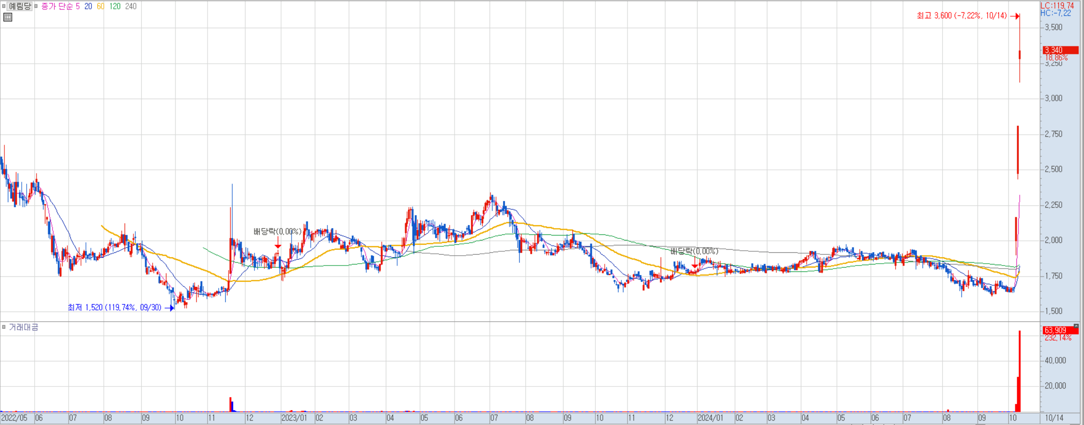 예림당의 경우 3거래일 연속 강한 흐름을 보여주었으며 현재는 거래량이 많이 터진 상황입니다.