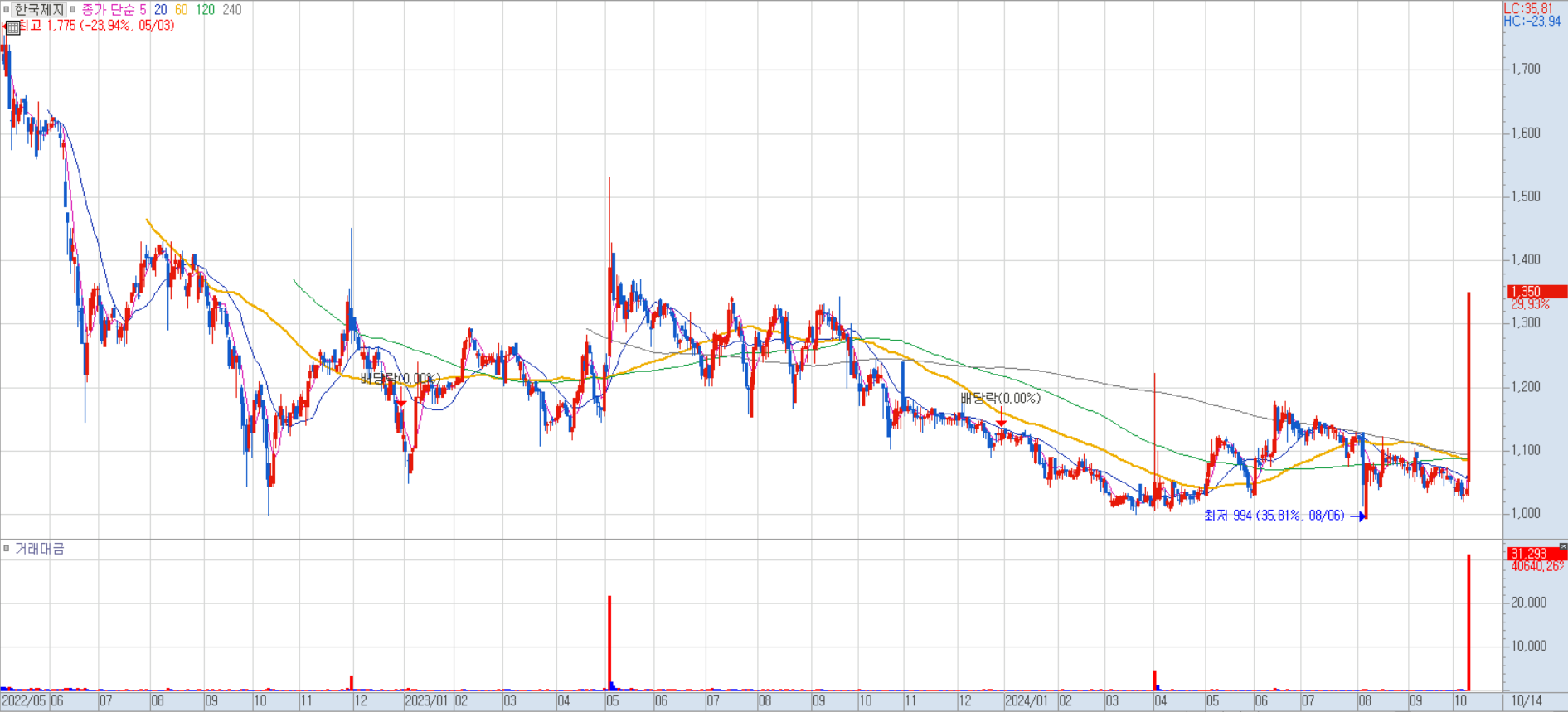 한국제지의 경우 출판으로 인한 수혜업종으로 분류되어 후발주자 느낌으로 추후에 거래가 들어온 것으로 보입니다.
