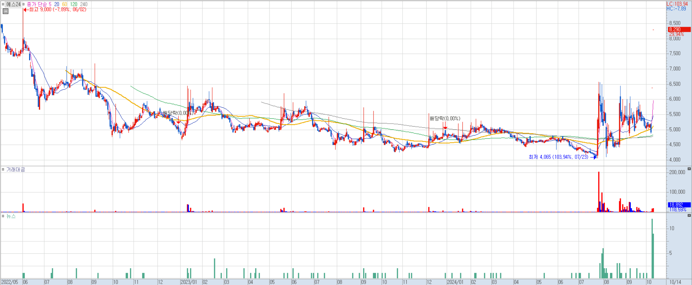 지금까지 나왔던 재료들은 티몬/위메프 사태, 피프피피프티 글로벌 계약, 한강작가 진출 소식으로 전부 개별재료들이 모여서 상한가를 만들어 냈다고 봅니다. 즉, 현실적으로 이 종목을 중장기 관점에서 선취매하는 것은 불가능하지 않았을까라는 생각이듭니다.