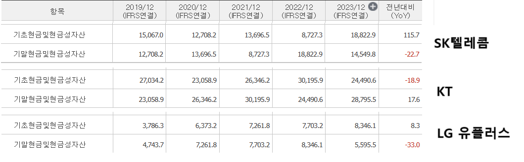 위 자료들을 참고하면 결국 쏠리드는 통신 3사의 투자가 적극적으로 이루어지게 되면 자연스럽게 매출이 늘것으로 예상됩니다. 그렇다면 투자 3사의 현금보유량은 어떻게 될까요? 아래 결과를 비교해 보면 KT가 현금성 자산이 가장 많은 것이 확인됩니다. 그렇다는 이야기는 KT가 5G 주파수 경매 당시 가장 유리한 위치에 있다고 생각됩니다. 추가로 KT의 경우 1분기 아파트 분양 수익 발생으로 2025년 역대 최대 실적을 기록할 가능성이 높다고 합니다.