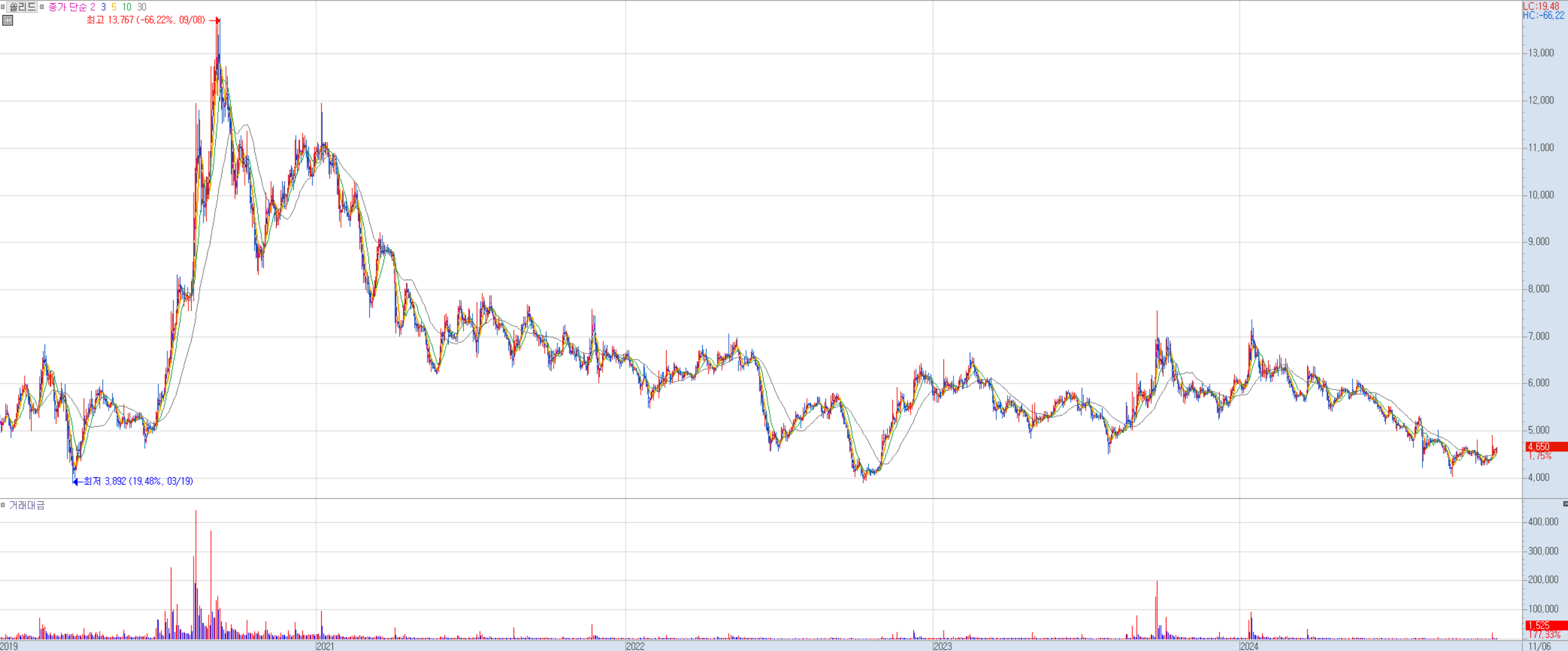 쏠리드 기업은 최근 5년간 가격중 하단권에 위치하고 있으며 최근 위 리포트가 발행됨에 따라 거래량이 들어왔었습니다. 5G 관련주에 관심이 있다면 한 번 지속 추적관찰할 필요가 있어 보입니다.