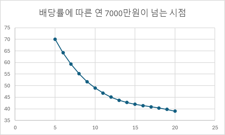 위 내용을 정리해보면 배당률에 따른 연 7000만원의 추가 수입을 얻는 시점은 다음과 같습니다.