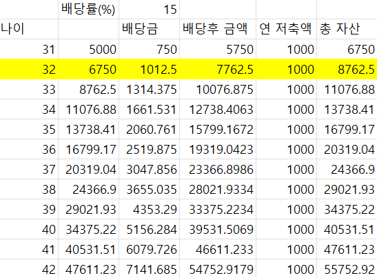 배당률 15% / 20%는 어떨까요? 이제는 42살 / 39살 이면 벌써 상위 10% 부자가 될 수 있습니다.