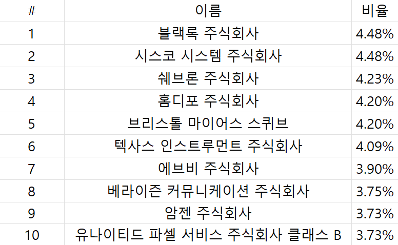 일반적으로 배당주는 경기 방어주의 성격을 띠는 경우가 많습니다. 경기 방어주는 경제 상황에 크게 좌우되지 않고, 상대적으로 안정적인 수익을 제공하는 기업들로 구성됩니다. 이러한 기업들은 주로 필수 소비재, 공공 서비스, 헬스케어 등 사람들이 경기 침체기에도 소비를 줄이기 어려운 상품과 서비스를 제공하는 산업에 속합니다. SCHD의 종목군을 살펴보면 아래와 같습니다.