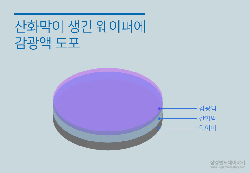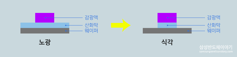 웨이퍼에 감광액(Photo resist)를 골고루 바른 후 웨이퍼 위에 마스크를 놓고 빛을 쪼아 주면 웨이퍼 위에 회로 패턴이 그대로 형성되게 됩니다. 이렇게 되면 resist의 화학적 성질이 변화하게 되며 현상(develop) 공정을 통해 resist에 원하는 패턴만 남기게 됩니다.