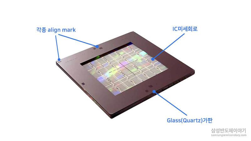 포토공정은 photo lithography를 줄여서 포토공정이라고 부릅니다. 이 공정은 웨이퍼 위에 회로 패턴이 그려진 마스크 상을 빛을 이용해 비춰 회로를 그리게 됩니다. 반도체 집적도가 증가할수록 포토 공정 또한 더욱 얇고 세밀하게 그려낼 수 있어야 합니다. 빛을 통해 회로를 그리기 위해서는 마스크가 있어야 합니다. 마스크는 순도 높은(quartz)를 통해 제작되며 세밀한 패턴을 만들기 위해 반도체 회로보다 크게 제작됩니다.