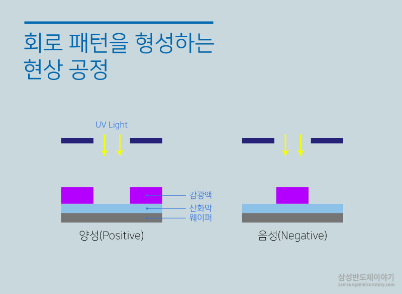 웨이퍼에 감광액(Photo resist)를 골고루 바른 후 웨이퍼 위에 마스크를 놓고 빛을 쪼아 주면 웨이퍼 위에 회로 패턴이 그대로 형성되게 됩니다. 이렇게 되면 resist의 화학적 성질이 변화하게 되며 현상(develop) 공정을 통해 resist에 원하는 패턴만 남기게 됩니다.