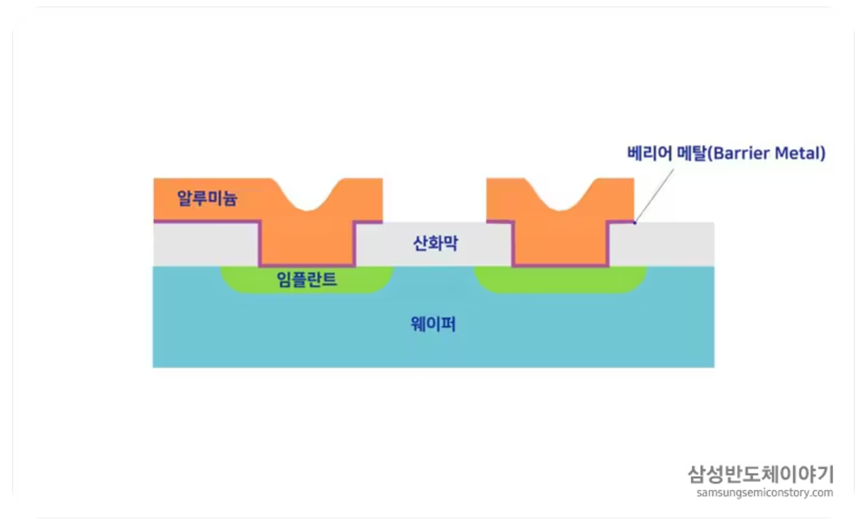 반도체 소자의 전기적 연결을 위해 금속 배선을 형성하는 단계입니다. 전기 전도도가 높고 가공성이 뛰어난 물질을 사용해야 하는데요, 이에따라 알루미늄(Al)이 주로 사용됩니다. 하지만 알루미늄의 경우 실리콘과 접촉시 서로 섞이기 때문에 알루미늄과 웨이퍼 접합면 사이에 베리어 메탈이라 불리는 금속을 증착하게 됩니다.