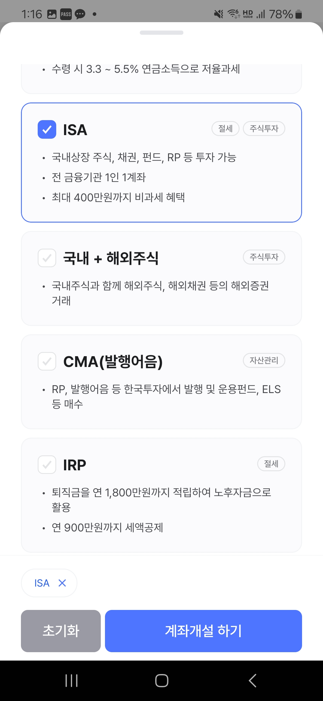 저 같은 경우는 ISA 계좌만 개설하려고 하므로 ISA 계좌를 선택하였습니다. 만약 다른 계좌가 필요하다면 선택해서 고르면 될 것 같습니다.