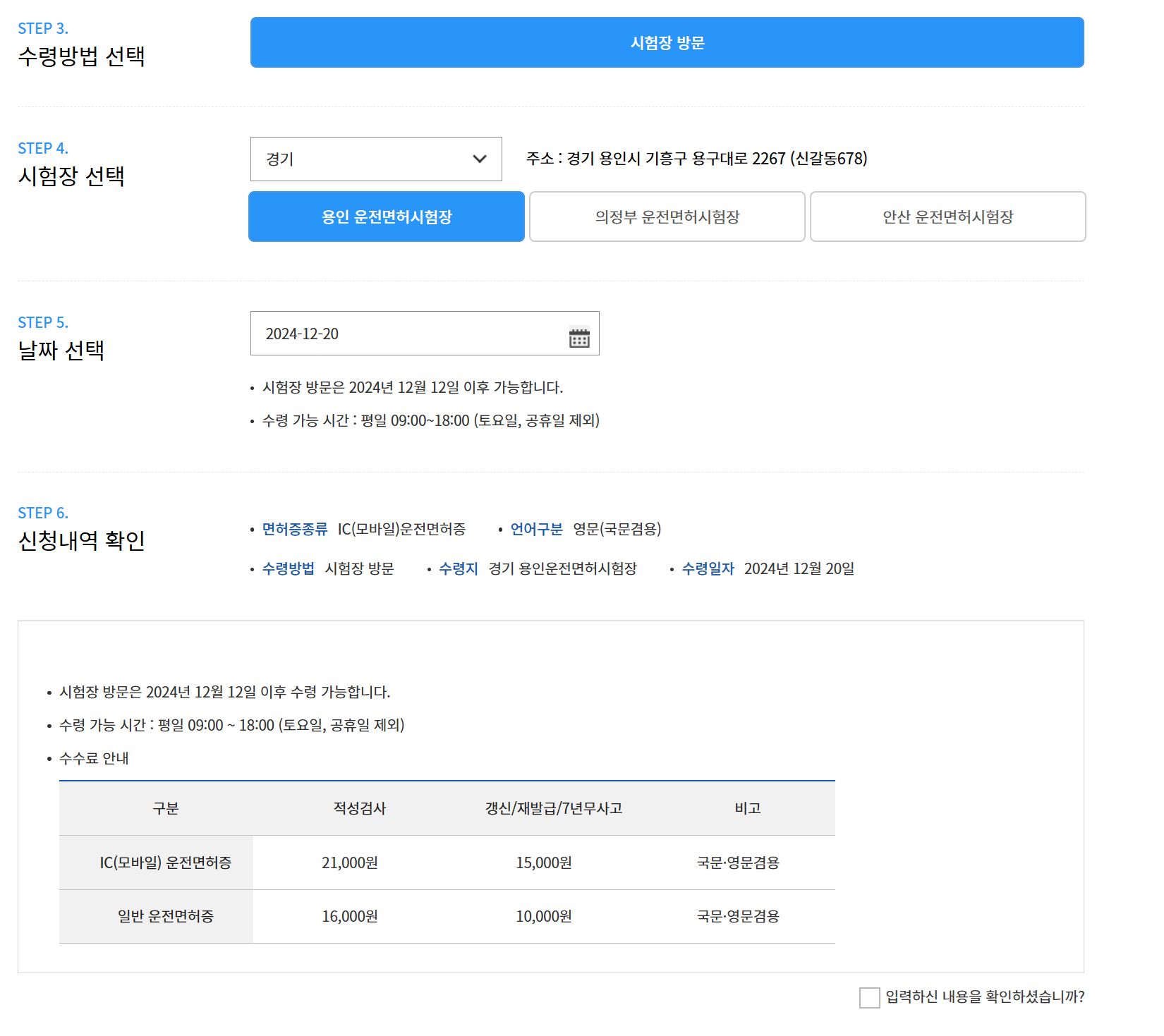 8. 수령방법을 선택해 주면 되는데요 저 같은 경우는 용인 운전면허 시험장이 가까워서 이곳으로 선택하였습니다. 다른 사람 이야기를 들어보면 회사앞 경찰서에서도 발급 가능하다던데 왠지 사서 고생하는 느낌이네요 ㅠㅠ 그래도 연말이라 사람 많았을 거라고 자기합리화 하면서 용인 운전면허 시험장으로 가기로 했습니다.