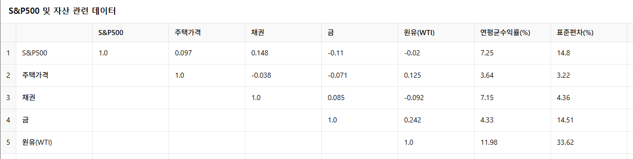 흔히 알려진 주식과 채권의 상관관계는 음의 관계로 알려져 있으나, 실제 값은 0.148의 상관관계를 가지기 때문에 조금 의외라고 할 수 있겠네요.