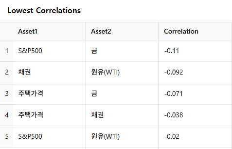 이를 통해 알 수 있는 것은 아래 자산군들이 가장 낮은 상관관계를 가짐을 알 수 있습니다.