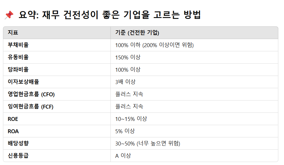 - 업종별 차이 고려: 제조업(설비 투자 필요)은 100~150%도 괜찮지만, 금융업은 부채비율이 높을 수밖에 없음.